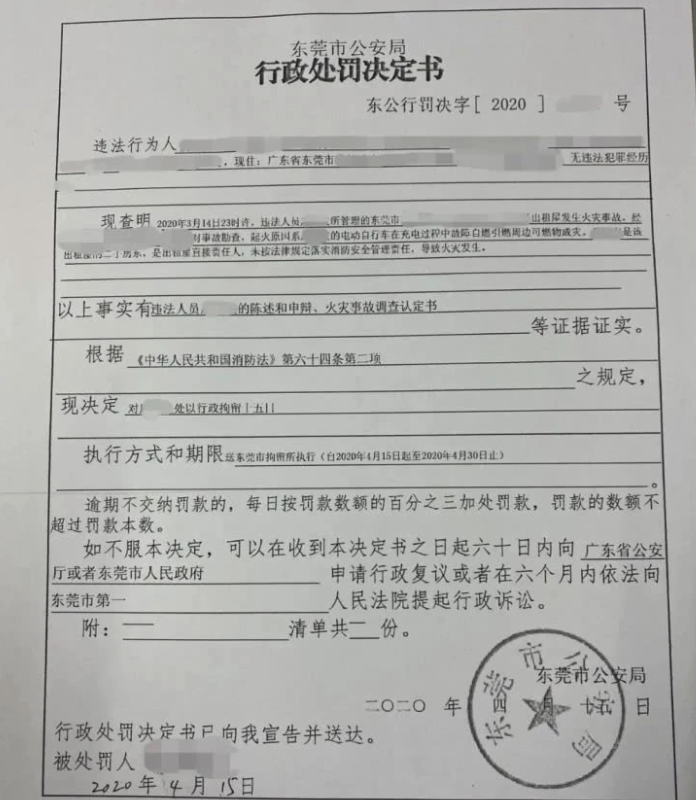 3月14日,东莞一出租屋发生火灾,起火源是楼梯间的电动自行车电池短路产生的火花引燃周边可燃物所致。经调查,该车主被处以行政拘留15日的处罚。