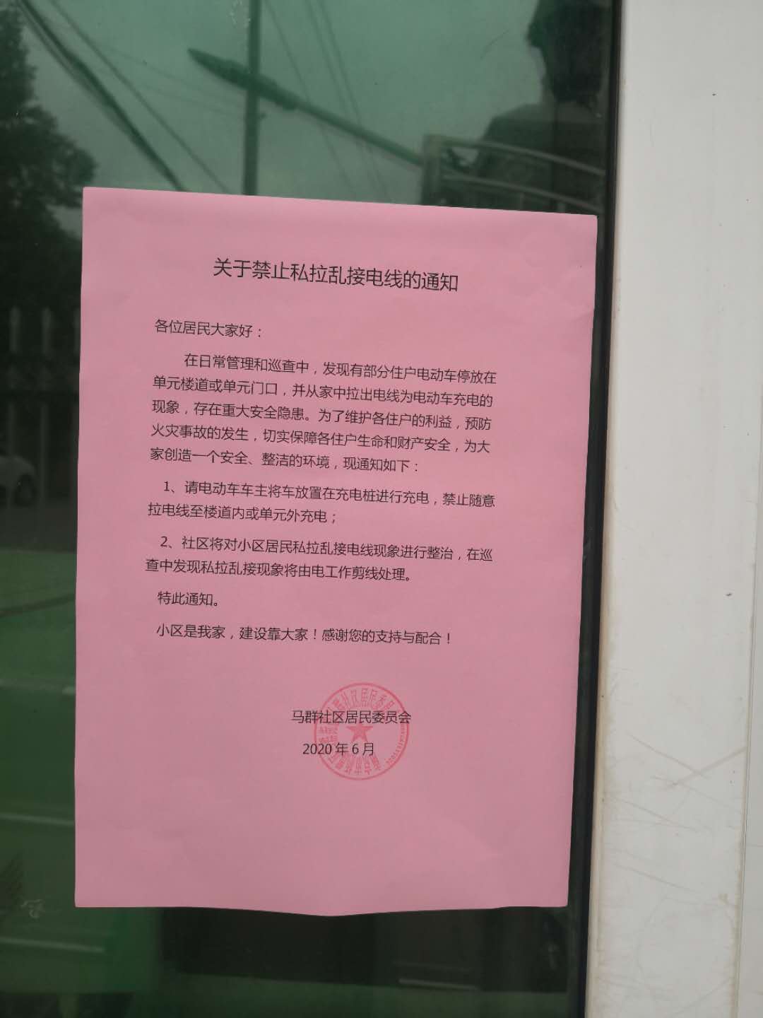 一时的方便,却给小区带来极大的安全隐患,这是关乎大家的安全,而不是某个人的安全。因此,电瓶车“飞线充电”问题必须解决。南京各个小区都在配合整治“飞线充电”。